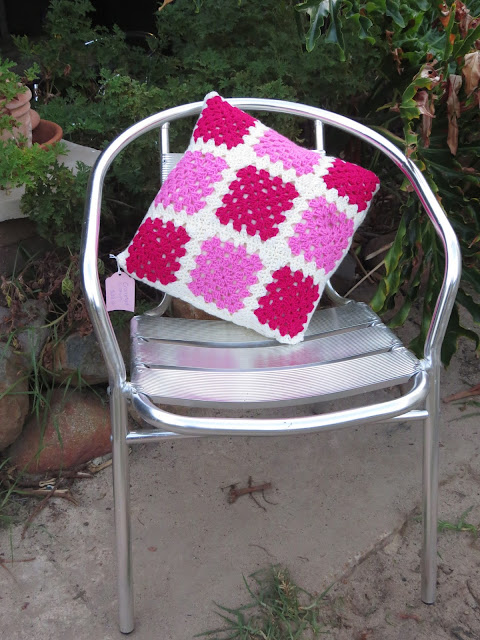 Love that 'pretty in pink' cushion. Your jumper is cool. Let's hope the weather cools down soon for you so that you can be seen round about town in it. Oh my, that baby cardie is tiny, but oh so cute. I suppose dark knits for children is a good idea.....especially as they love to wear dirt. =)